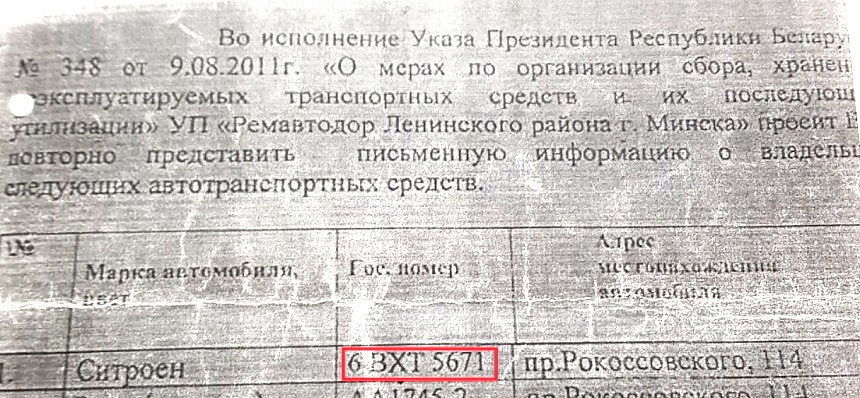 Чиновники попытались переложить ответственность на автовладелицу: "Автомобиль длительное время находился на неохраняемой уличной парковке… имел признаки неэксплуатируемого, чем нарушал Указ Президента №348"... А дальше - сюрприз! "По сообщению ОГАИ Ленинского РУВД г. Минска, направленному в адрес "Ремавтодора Ленинского района г. Минска", автомобиль Citroёn с регистрационными знаками 6ВХТ5671 на территории Республики Беларусь не был зарегистрирован".