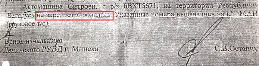 В ответе за подписью Вриод начальника Ленинского РУВД г. Минска указывается, что автомашина Citroёn на территории Республики Беларусь не регистрировалась, транзитные регистрационные знаки вообще выдавались на грузовой автомобиль.