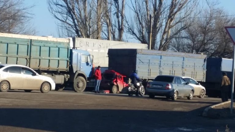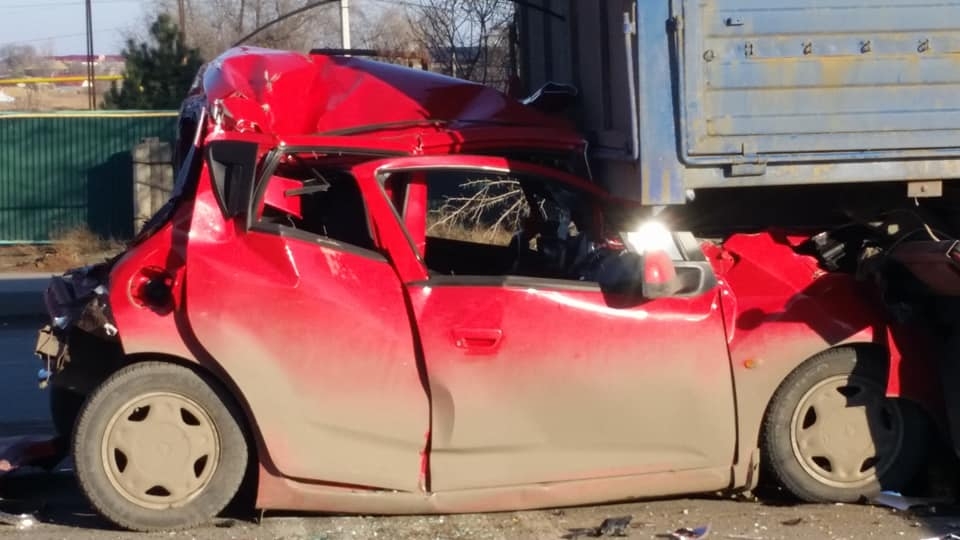 В районе Приволжчья под Астраханью слушилась серьезная авария. Две фуры зажали «Фольксваген Поло». Машину буквально спрессовало в гармошку.