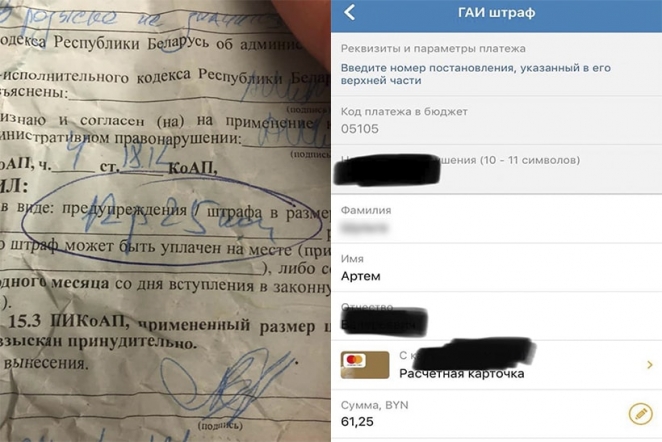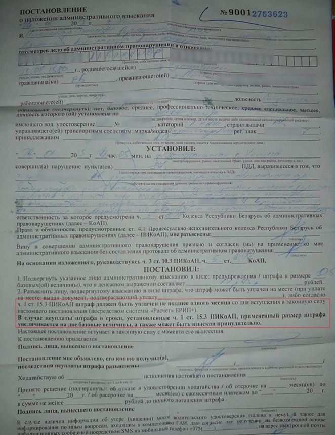 История Александра такова: «Допустил небольшое ДТП на парковке. Повреждения минимальны, но вызвали ГАИ. Мне выписали постановление, штраф — 12,75 рубля. Вскоре на работе меня направили в командировку. Сумму я не оплатил. Когда вернулся и ввел в ЕРИП данные платежа, мягко сказать, неприятно удивился увиденным цифрам — 63,5 рубля. Начал пересматривать бумаги. Нашел строчку — мол, если не оплатите в течение месяца, размер штрафа увеличивается на две базовые величины. Меня возмутило, что не было никакого предупреждения, оповещения — мол, срок подходит к концу».