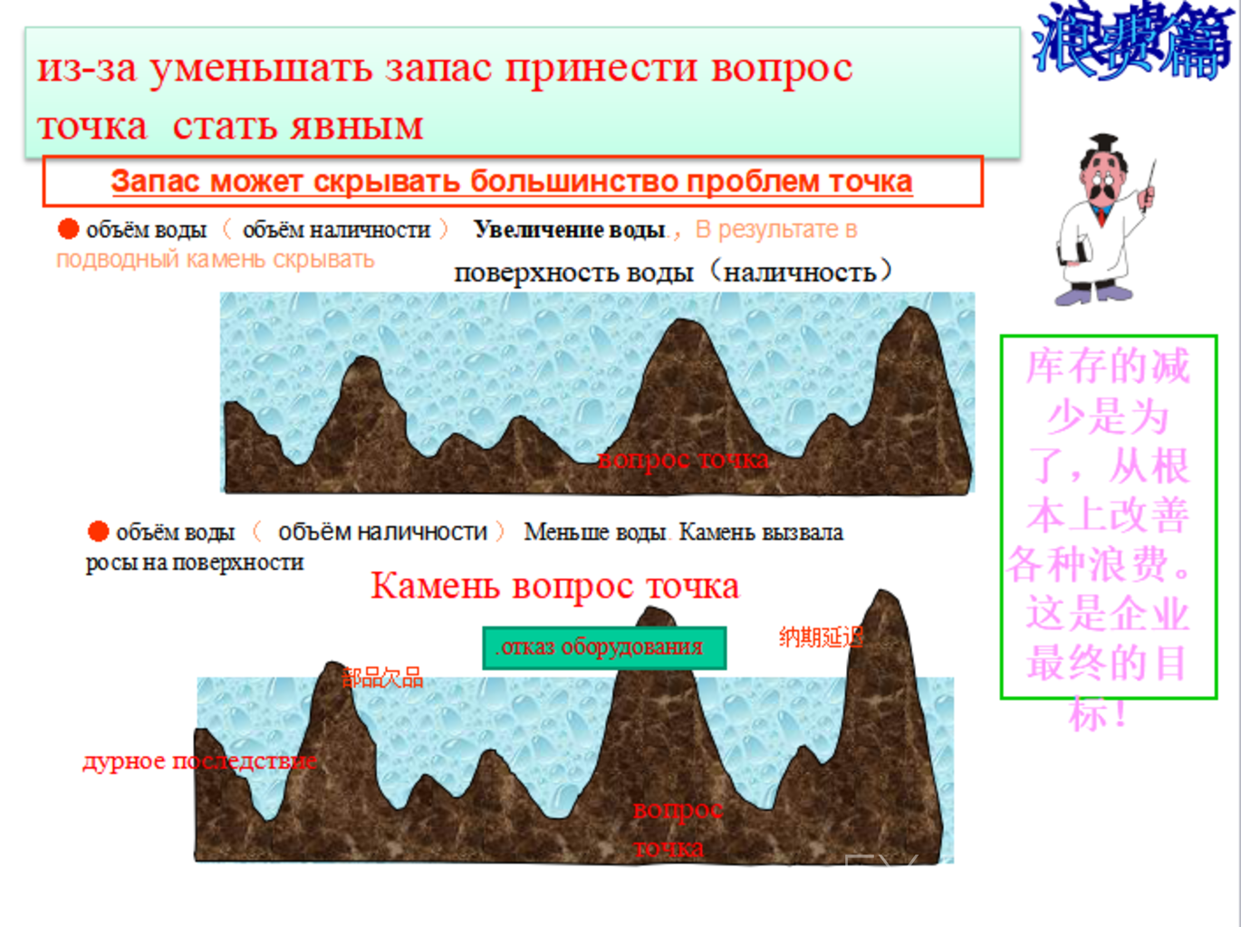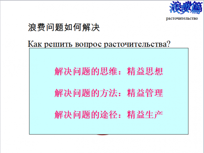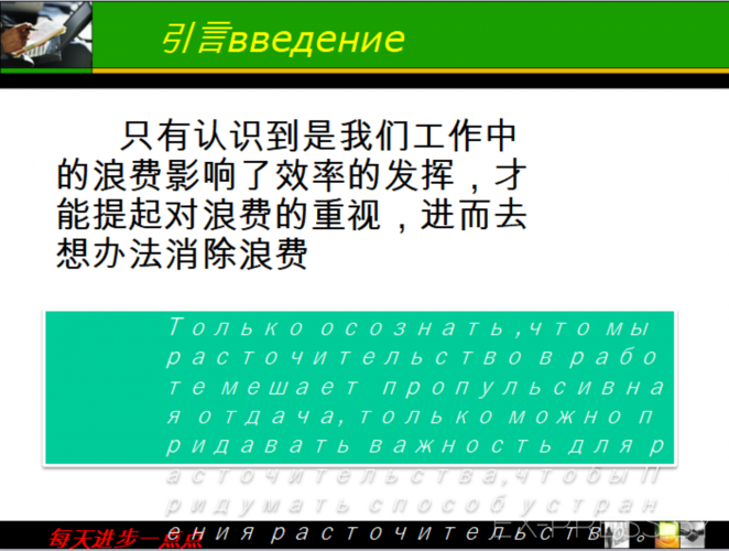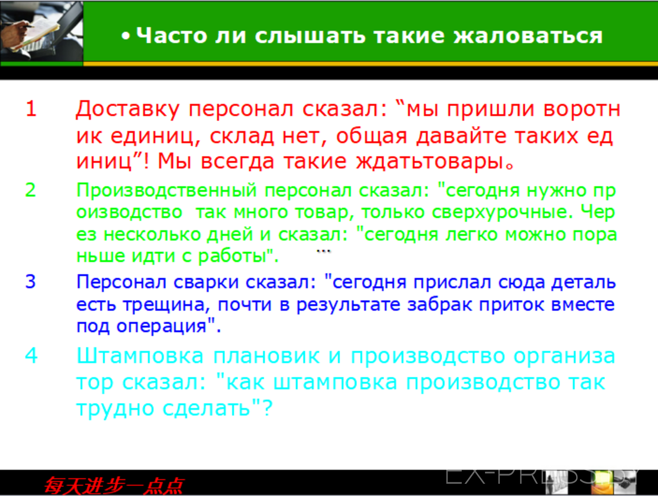 Красочные картинки повествовали о руководителе компании, ее истории, содержали самую общую теоретическую часть производственного процесса и связанных с ним понятий. Например, была лекция, посвященная расточительству, его причинам и последствиям. «敷衍了事的应付浪费халтурить , чтобы лишь отделаться、небрежное расточительство» (оригинал написания сохранен автором) — гласил текст на одном из слайдов. «Создать веселое условие работы» — тема еще одной подборки фотоматериалов, преимущественно на китайском языке.