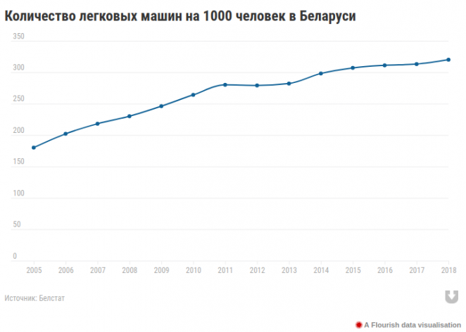 По итогам 2018 года в Беларуси насчитали чуть более 3 млн легковых автомобилей, находящихся в собственности граждан. Это на 58 300 авто больше, чем было зафиксировано в 2017 году. Таким образом, на 1000 жителей приходится 320 легковых автомобилей. По этому показателю Беларусь занимает среднюю позицию в рейтинге автомобилизации стран мира. Общее же количество транспортных средств в Беларуси, включая автобусы и грузовые автомобили, — 3 млн 615 тысяч 833 единицы. При этом численность населения на 2018 год составляла 9 млн 501 тысяча 368 человек.