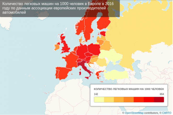 В Европе самым автомобилизированным государством является Люксембург. Там на тысячу жителей приходится 654 автомобиля. В известной своим автопромом и идеальными дорогами Германии этот показатель составляет 556 машин. А больше всего ходят пешком или передвигаются на общественном транспорте в Турции — там на тысячу жителей приходится всего 142 автомобиля.