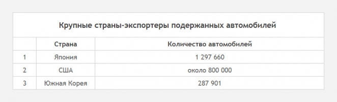 На сегодняшний день в числе крупнейших экспортеров подержанных машин располагаются Япония (по итогам 2017 г. было перепродано на другие рынки почти 1,3 млн автомобилей), США (около 800 тыс. единиц) и Южная Корея (примерно 300 тыс.).