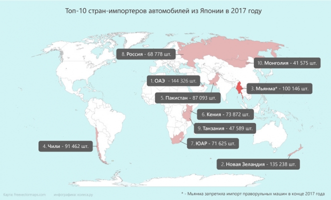 Так, для Японии ключевые "клиенты" - небольшие азиатские страны, такие как Мьянма, Пакистан и Шри-Ланка, африканский континент в лице Кении, ЮАР, Уганды и прочих, некоторые южноамериканские страны вроде Чили, а также "праворульная" Новая Зеландия, являющаяся одним из крупнейших импортеров японских машин. При этом стоит учитывать, что некоторые импортеры, в частности крупнейший в лице ОАЭ, закупают их не для пополнения своего автопарка, а для дальнейшей перепродажи в ту же Кению (около половины), Центральную Африку, Пакистан, Афганистан и другие страны.