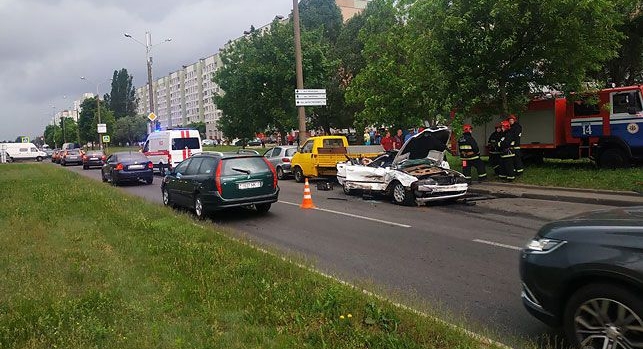 Автомобиль BMW двигался по ул. Селицкого со стороны пр. Партизанского в направлении ул. Бачило. По предварительной информации, вблизи дома №105 водитель не справился с управлением и врезался в припаркованный вдоль дороги Iveco. Фургон отбросило за пределы проезжей части, где он въехал в дерево. А BMW после наезда на Iveco врезался в припаркованный Volkswagen .