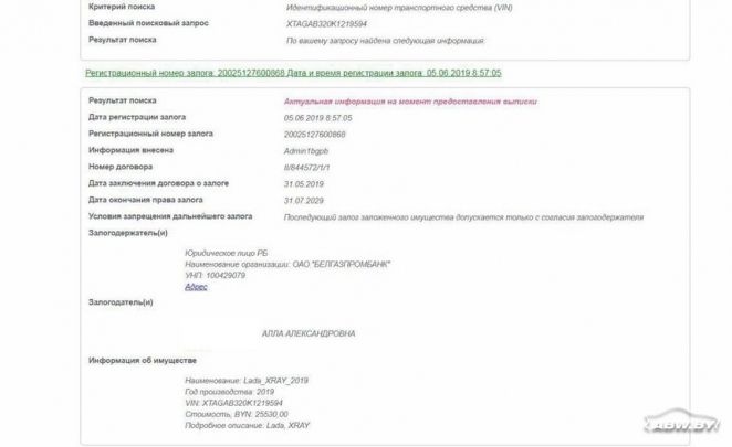 Мы позвонили в ГАИ Бобруйска, где был снят с учета залоговый LADA Xray. Нам пояснили, что машину, которая находится в залоге у банка, снять с учета нельзя, это обязательно проверяется. Но у ГАИ нет общей базы с банком. В техпаспорте залог никак не отмечается. Если банк не предоставляет сведения о том, что та или иная машина находится в залоге, то и информации о том, что транспортное средство находится в залоге, у Госавтоинспекции нет.