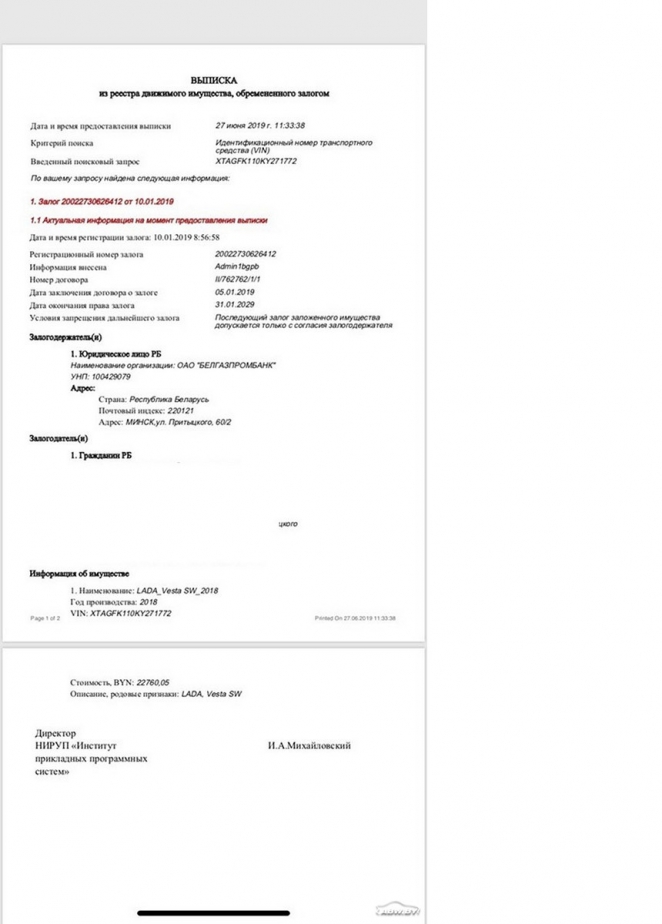 Lada Vesta также находится в залоге у Белгазпромбанка. Странное совпадение, не правда ли? 5 января был составлен договор о залоге с банком. Окончание права залога также в 2029 году.