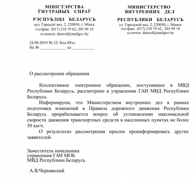 Ответ размещен на сайте petitions.by. Обращение, под которым подписалось 759 человек, было направлено в МВД 9 сентября. В петиции авторы предлагали установить ограничение скорости в населенных пунктах на уровне 50 км/ч. Отмечалось, что такая мера рекомендована ВОЗ и по данным организации позволяет на 40% сократить смертность при столкновении автомобилей и пешеходов. Ограничение в 50 км/ч действует в 97 странах.