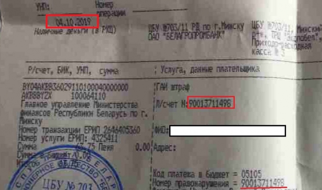 Обратите внимание - номер правонарушения и лицевой счет в квитанции одинаковые, и эти данные должны совпадать с номером постановления, которым наложено взыскание. Все сходится, кроме суммы штрафа. Дата оплаты - 4 октября, до дня "икс", когда штраф должен увеличится на 2 б.в., еще две недели.