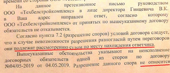 Пока правоохранители отказывают заявителям в возбуждении уголовных дел, мотивируя это наличием в действиях должностных лиц этой фирмы только гражданско-правовых отношений. Однако есть веские основания предполагать, что потерпевших от деятельности ООО "Техбелстройкомплекс" гораздо больше. Поэтому можно говорить о составе преступления.