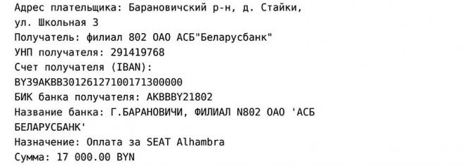 Александр и Ирина Бурнашовы (г.п. Зельва): "Договор с ООО "Техбелстройкомплекс" мы заключили 14 мая 2019 года. Хотели купить VW Sharan или Seat Alhambra из Германии. Согласно договору, на расчетный счет этой фирмы мы перечислили сразу 100% суммы в размере 17.000 рублей, и сотрудники фирмы за 35 дней обязались предоставить автомобиль.