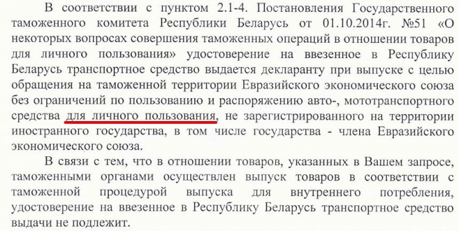 Мы отправили запрос в Могилевскую таможню о выдаче данного документа и вскоре получили ответ, в котором говорилось, что вышеуказанное удостоверение выдается только при ввозе автомобиля для личного пользования, а мы ввезли на организацию, то есть для внутреннего потребления. И для автомобилей, которые ввезены на территорию Республики Беларусь для внутреннего потребления, документов, выданных Могилевской таможней ранее, достаточно.