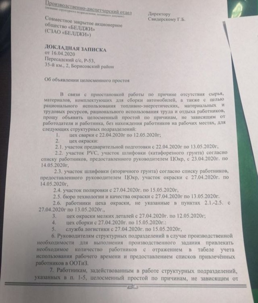 В документе, опубликованном на предприятии, основной причиной простоя названо отсутствие материалов и комплектующих для сборки автомобилей. Завод попросту не может производить свою продукцию.