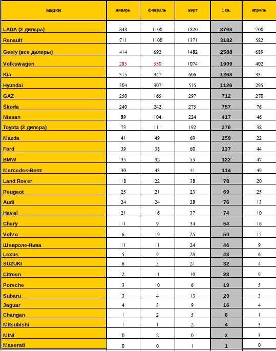 В 2020 году больше всего продаж по-прежнему приходится на долю Lada (21% белорусского рынка). В частности, за минувший месяц марке удалось реализовать 700 авто. Вторую строчку среди автобрендов удерживает Renault (582 шт.). Geely в апреле посчастливилось продать 689 машин, но в общем списке по итогам прошедших месяцев 2020-го компания занимает третью позицию. Четвертое место закреплено за Volkswagen (402 шт.), пятерку самых популярных транспортных средств вновь закрывает корейская марка Kia — у нее на счету 331 экземпляр.