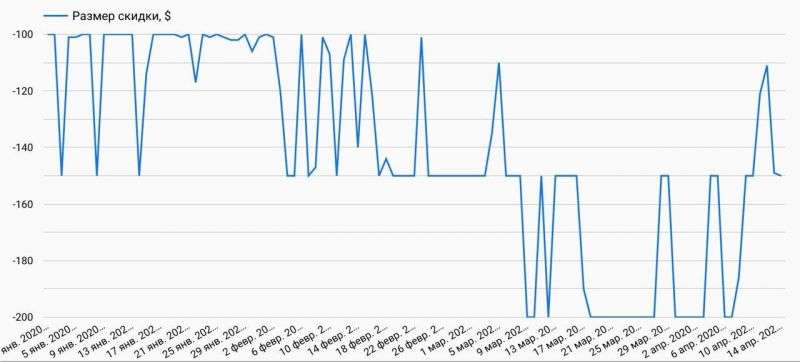 150 долларов — именно на такую цифру одномоментно корректировали стоимость продавцы. С середины марта средняя скидка выросла до $200, но первая же стабилизация курса рубля в апреле вернула максимальный размер дисконта до прежних медианных значений. В процентном выражении средняя величина скидки составила 4-5% от стоимости транспортного средства.