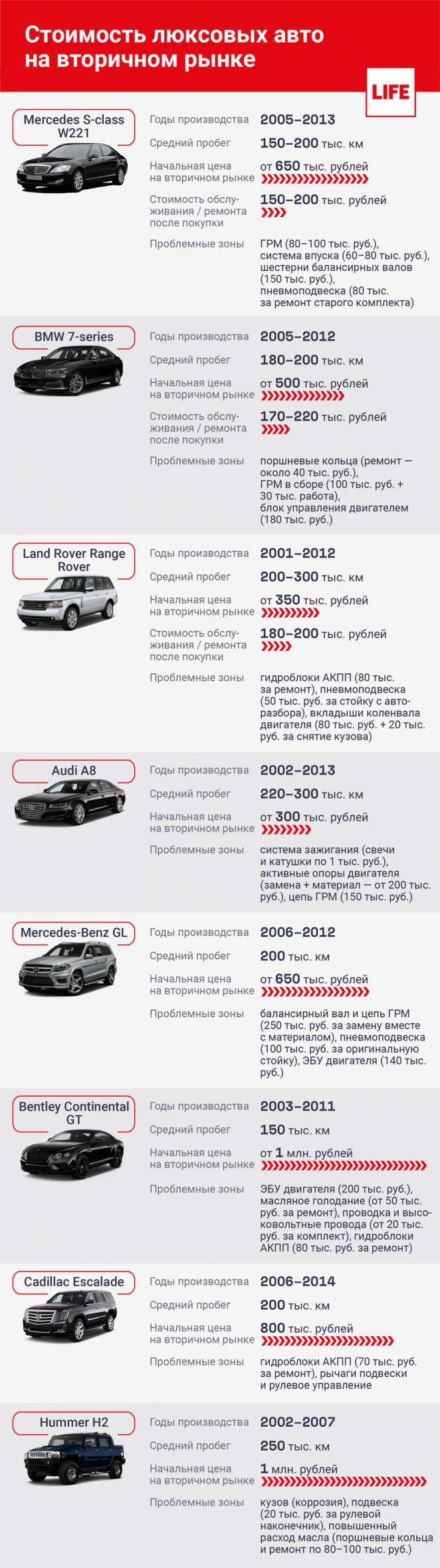 Чем меньше денег у владельца, тем скорее от такой машины начинают избавляться. По этой причине многие Mercedes-Benz S-класса, BMW 7-й серии, Ranger Rover и другие статусные автомобили, именуемые в народе «понторезками», часто оказываются на вторичном рынке, и уже через пять лет в ПТС этих автомобилей вписано по шесть-семь владельцев. Цены на некоторые автомобили начинаются с нескольких сотен тысяч рублей, и за такую сумму (как правило, по «низу» рынка) можно купить даже эксклюзивный автомобиль. Но после того как авто меняет владельца, покупателю открывается удивительный мир колоссальных расходов и страшных цен на ремонт и оригинальные запчасти.