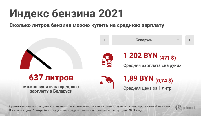 Команда аналитиков Picodi.com проследила, как изменились цены на топливо в первой половине 2021 года относительно прошлого года, и подсчитала, сколько литров бензина могут купить белорусы на среднестатистическую заработную плату. Результатами работы исследователи поделились с Thinktanks.by.