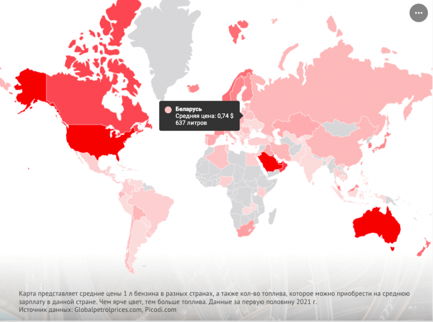 Средняя стоимость бензина за первое полугодие 2021 года в 104 странах была взята с сайта globalpetrolprices.com и других локальных источников. Для вычисления количества литров топлива, которое можно купить на месячную зарплату, мы разделили среднюю заработную плату после уплаты налогов на среднюю цену 1 литра бензина. Для конвертации валют использовался средний курс Google Finance за последние 90 дней.