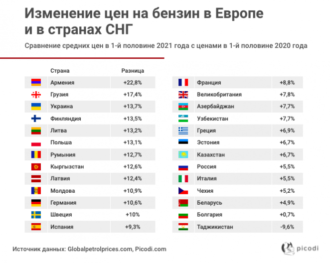 Первая половина 2021 года отметилась постепенным оживлением экономики и ростом цен на бензин по сравнению с аналогичным периодом 2020 года. Из стран СНГ самый значительный скачок цен произошёл в Армении (+22,8%) и Грузии (+17,4%).