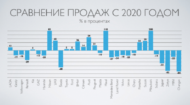 Согласно представленной ассоциацией статистике, из 31 бренда, реализовывавшего свои машины в 2020-21 годах, 17 сократили продажи, увеличили их – 14. Сильнее всех обвалились китайские Zotye (-82%) и Changan (-84%), Škoda упала на 68% – это последствия белорусских санкций. В результате один из лидеров рынка в минувшие годы занял в общем списке лишь 10 место.