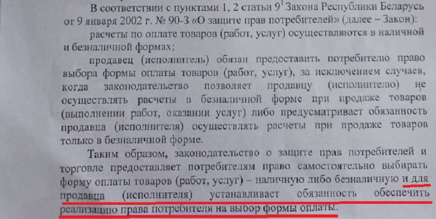 К примеру, по Закону РБ "О защите прав потребителей" расчеты по оплате товаров (работ, услуг) у нас в стране осуществляются как в наличной, так и безналичной формах (ст.9-1 Закона). При этом продавец обязан предоставить покупателю право выбора формы оплаты. В нашем случае налицо ограничение выбора.