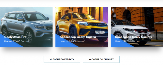Говоря о Geely в белорусском контрексте, также стоит отметить, что на текущий момент белорусско-китайский производитель предлагает только три модели авто. Самая дешевая из них — Geely Coolray, стоимостью от 73 900 рублей (около 28 500 $). С наличием и выбором проблем нет. Также для покупки авто белорусского производства можно воспользоваться льготными условиями кредитования или лизинга.