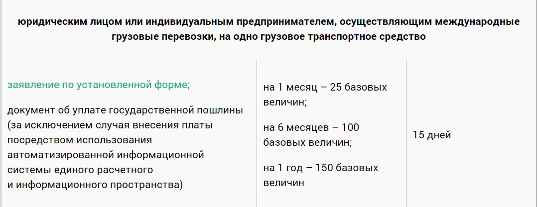 ИП и юридические лица, осуществляющие международные перевозки, могут приобрести пропуски сроком от одного месяца до одного года. Месячный пропуск стоит 25 б. в. (800 рублей), пропуск на полгода — 100 б. в (3 200 рублей), на год — 150 б. в. (4 800 рублей).
