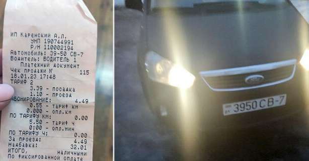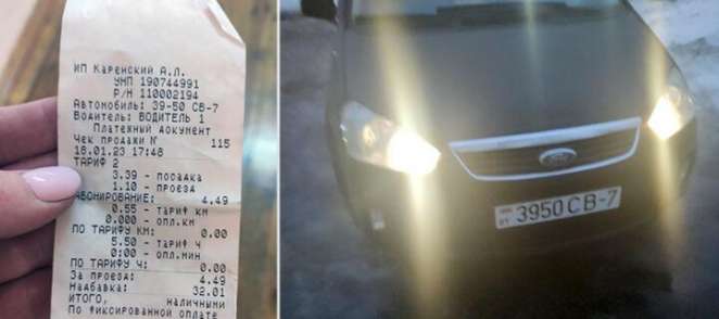 Чек, который выдал минчанке таксист и автомобиль такси. Январь 2023 года. Фото: Onliner.by