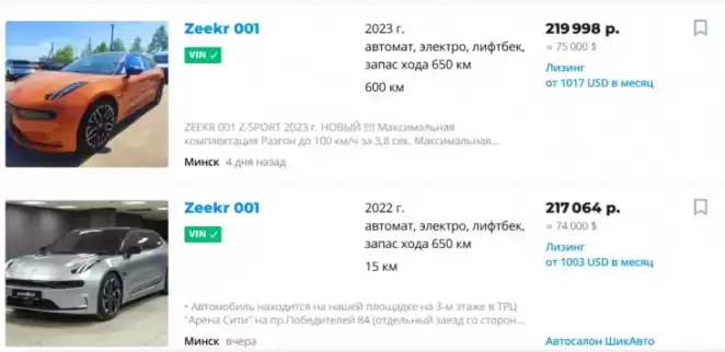 Цены на новые Zeekr 001 по состоянию на май 2023 года. Фото: скриншот с сайта av.by от 19.05.2023