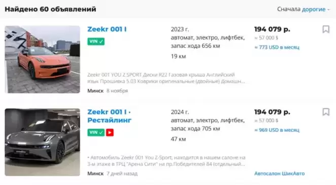Цены на самые дорогие варианты Zeekr 001 в декабре 2024 года. Фото: скриншот с сайта av.by по состоянию на 11.12.2024