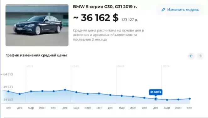 BMW 5 серии 2019 года в декабре 2023 года стоила в среднем 35 680 долларов. Спустя год цена не только не изменилась, но даже немного подросла. Сейчас средняя стоимость таких машин составляет 36 162 доллара.