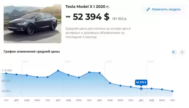 Tesla model X 2020 года за год подешевела с 62 тысяч долларов (декабрь 2023 года) до 52 тысяч долларов. Но если взять более длительный период, то падение будет еще более заметным.