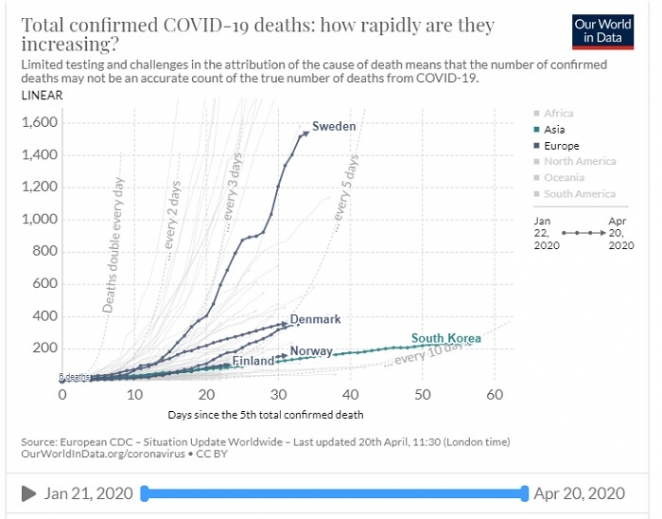 По информации Университета Джонса Хопкинса, на 20 апреля в Швеции было зарегистрировано около 14800 случаев заражения коронавирусом и порядка 1580 смертей.