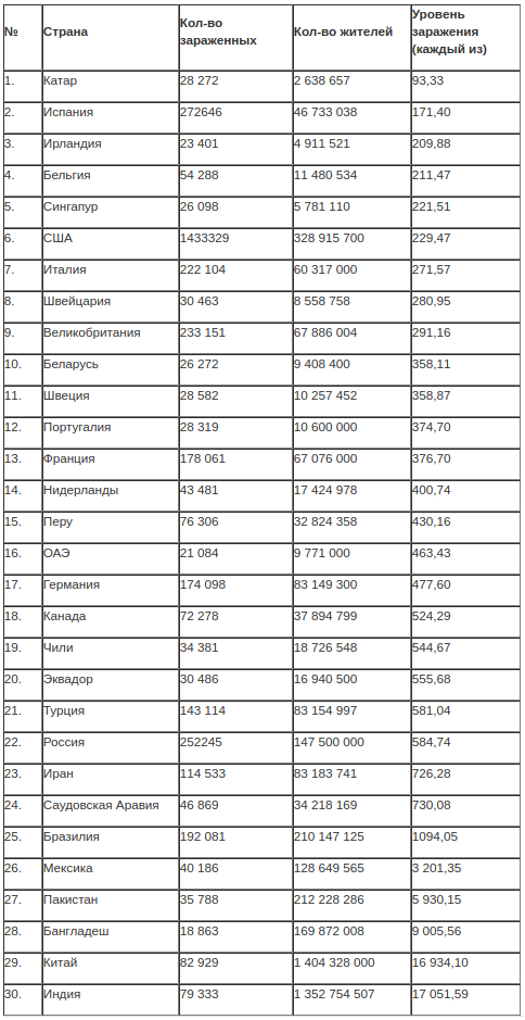 Правда, считать уровень заражения по общему количеству зараженных, не совсем верно. Одно дело 9,4 млн жителей и совсем другое 147,5 млн. Понятно, что в стране, где живет больше людей, будет и больше зараженных. Это не показатель эффективности противоэпидемиологических мер. Поэтому «Ежедневник» определил уровень зараженности 30 указанных лидеров по довольно простой формуле – поделил количество жителей на количество зараженных. По большому счету нужно еще учитывать и плотность населения, но это уже слишком сложно, так как не определена степень влияния плотности на заражение.