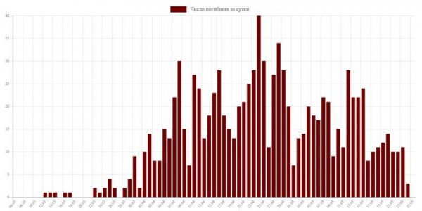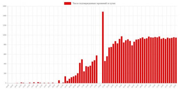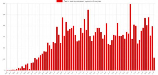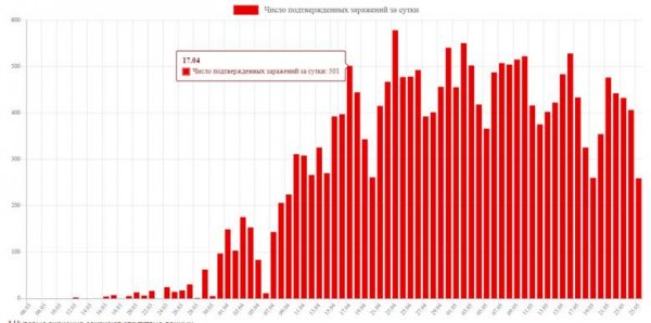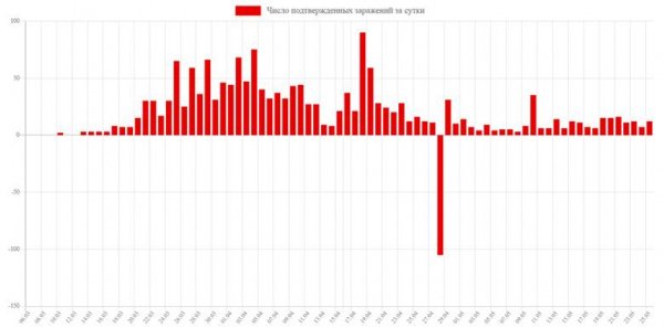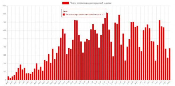 На диаграмме отчетливо видны и всплески заболевания, и падения, и общая тенденция. Например, на 11 апреля 46 заболевших за сутки, а на следующий день уже вдвое больше – 99. Три дня идет приблизительно одинаковая динамика, потом опять снижение в двое, а еще через двое суток – почти десятикратный рост. И это, повторимся, в условиях жесткой изоляции.