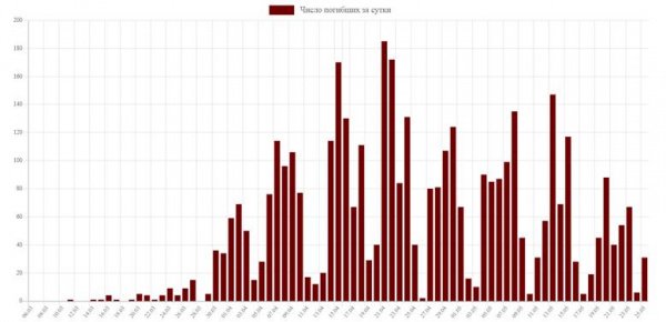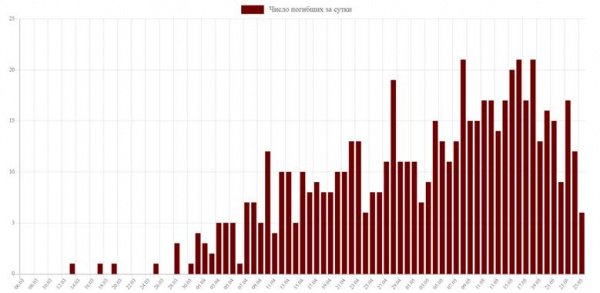 Еще более потрясающих успехов белорусской системе здравоохранения удалось достигнуть по количеству погибших от коронавируса. Если взять, например, данные за последний месяц, то в нем по 13 дням будут абсолютно одинаковые данные – 4 погибших. Еще 13 дней другое, невероятное количество погибших – 5 человек. Самый большой всплеск – 12 мая, когда произошел рост с 4 до 7 погибших.