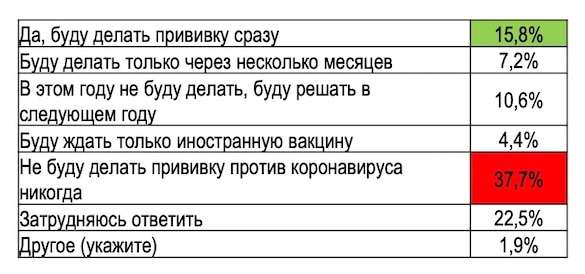 При этом 37,7% заявили, что не будут делать ее никогда. Подавляющее большинство отказников - 73% - это те, кто не верит в коронавирус, а также те, кто отрицает эффективность прививок в целом (80,8%).