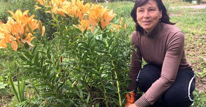 — Вы лучше спросите: что вырастает, — смеется. — Сажаю чеснок, лук, кабачки, картошку, перцы. У меня и возле дома есть грядка. Там я сажаю цветы — в основном луковичные, потому что другие могу выдернуть с травой. А какие у меня цвели ирисы... Голубые, фиолетовые и разноцветные были: серединка белая, а лепестки бордовые...