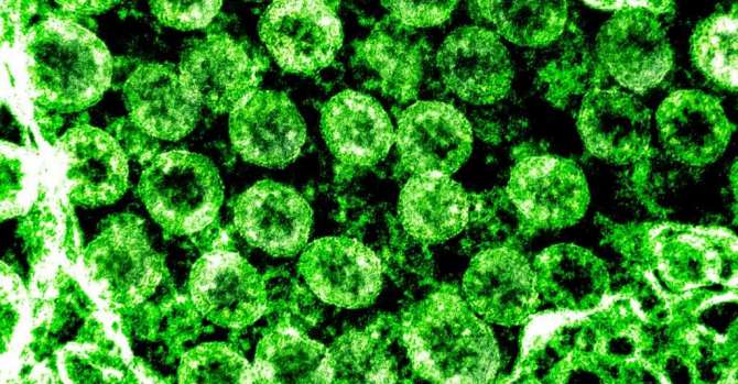 Вторжение вирионов SARS-CoV-2 под электронным микроскопом. Вирионы коронавирусов с помощью шипов на своей поверхности прикрепляются к рецепторам в некоторых клетках человеческого организма - особенно в легких - и затем проникают внутрь клетки. Фото: Национальный институт аллергии и инфекционных заболеваний США