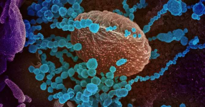 Вирионы SARS-CoV-2, которые разрастаются в клетке человеческого организма. Фото: Национальный институт аллергии и инфекционных заболеваний США