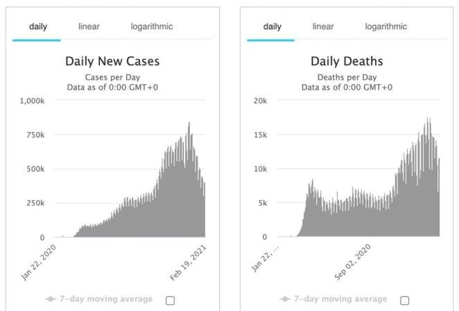 Диаграмма: дневное количество обнаруженных заражений (слева) и количество смертей от ковида (справа) в мире. Последний месяц фиксируется снижение и количества случаев, и смертности. Графики worldometers.info.