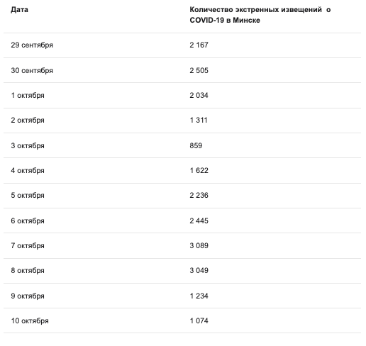 В таблице за 7 октября — информация о 3089 экстренных извещениях для 3076 пациентов. Информация получена из 83 минских организаций здравоохранения — поликлиник, больниц, РНПЦ, медцентров.