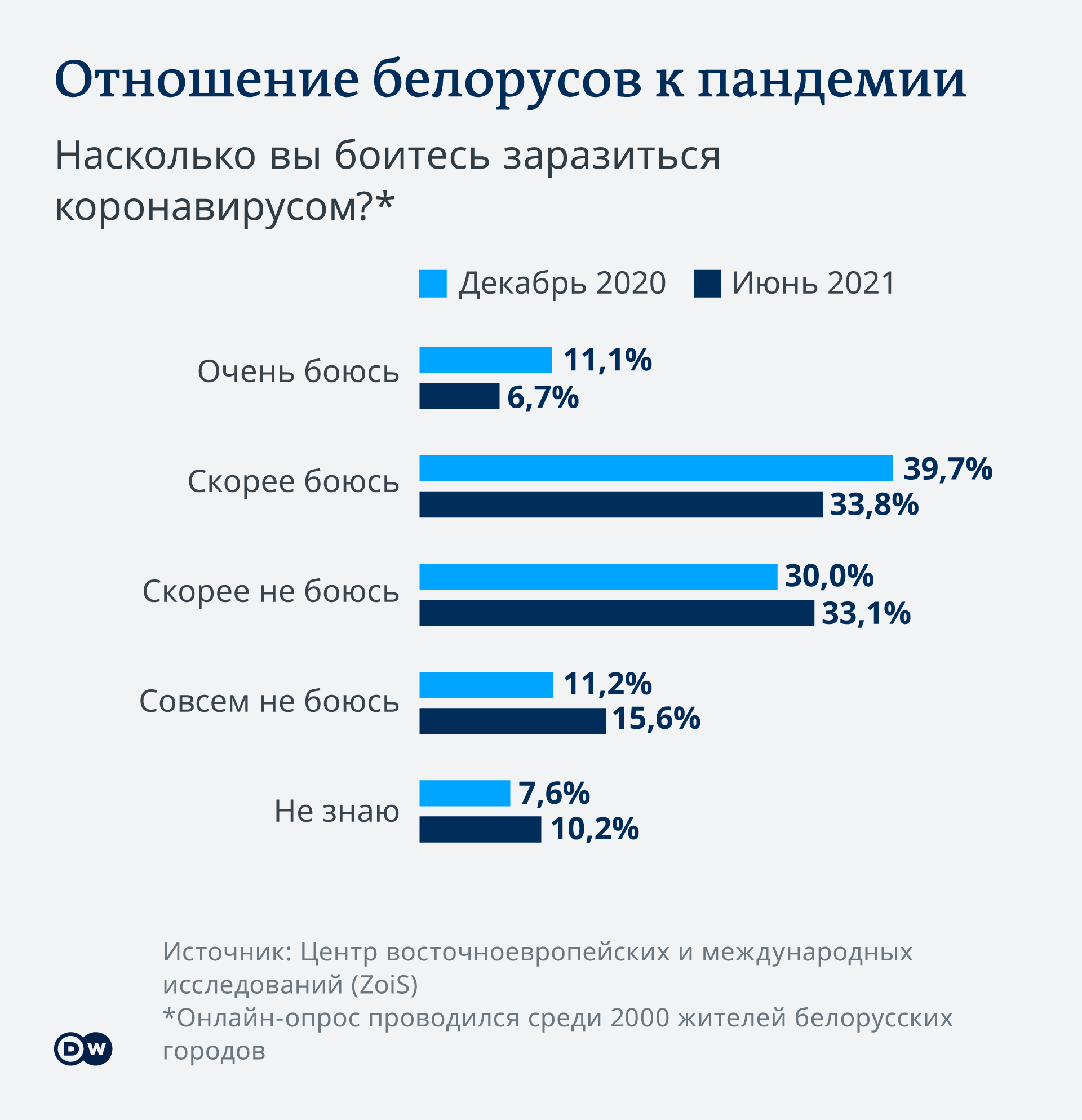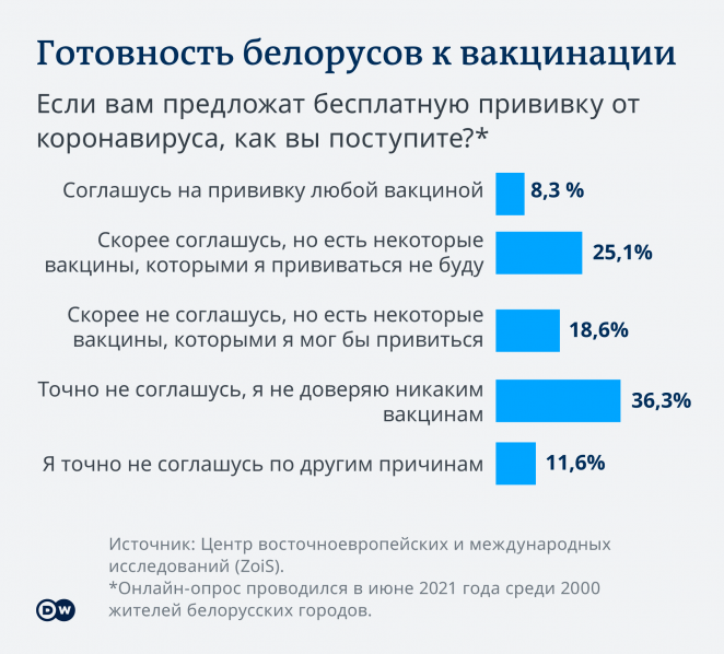Результаты опроса ZoiS в целом отражают уровень недоверия белорусов к власти. Так, до 50% опрошенных немецкими социологами в июне 2021 года выступали однозначно против вакцинации. Лишь 8% респондентов готовы были сделать прививку.