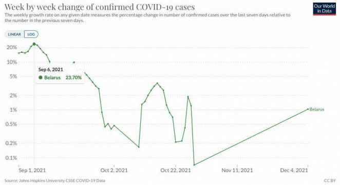 Так выглядит темп прошлогоднего роста заболеваемости ковидом в Беларуси по официальной статистике. Наибольший прирост в 23% мы наблюдали в начале сентября 2021 года. В соответствии со словами министра, нынешний прирост должен быть вдвое ниже, а это значит — около 10—12%. Правда, белорусская картинка не вписывается в картину региона.