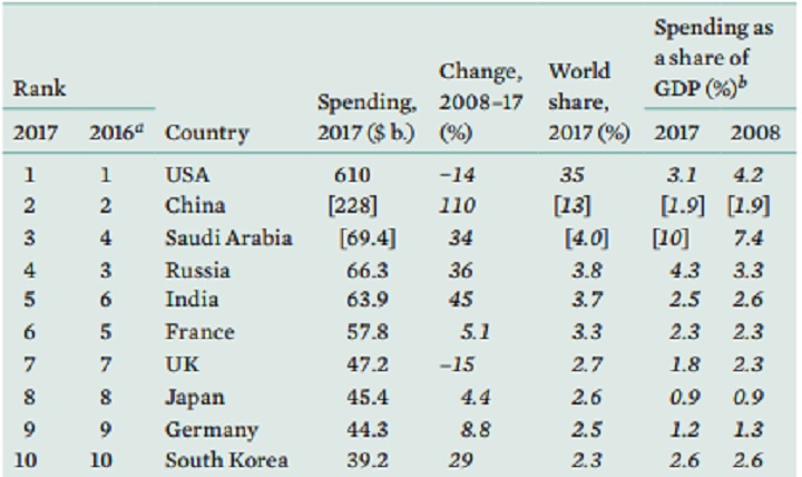 Лидирующее место в составленном институтом рейтинге занимают США, чьи военные расходы в 2017 году превысили общий объем расходов в семи следующих за страной крупнейших военных экономиках мира, в том числе России, Китая, Индии, Франции и других стран.