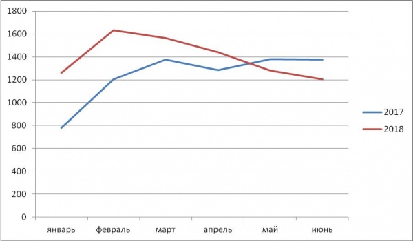 Как видно из представленного графика, в 2017 году рынок практически все первое полугодие рос, за исключением марта. Однако в 2018 году рынок шел в рост только январь-февраль, а уже последующие четыре месяца неизменно идет вниз. При этом уже в июне спрос достиг показателя февраля 2017 года, что уже о многом свидетельствует. Эксперты полагают, что во втором полугодии снижение продолжится, хотя некоторые месяцы могут наблюдаться и некоторые всплески активности.