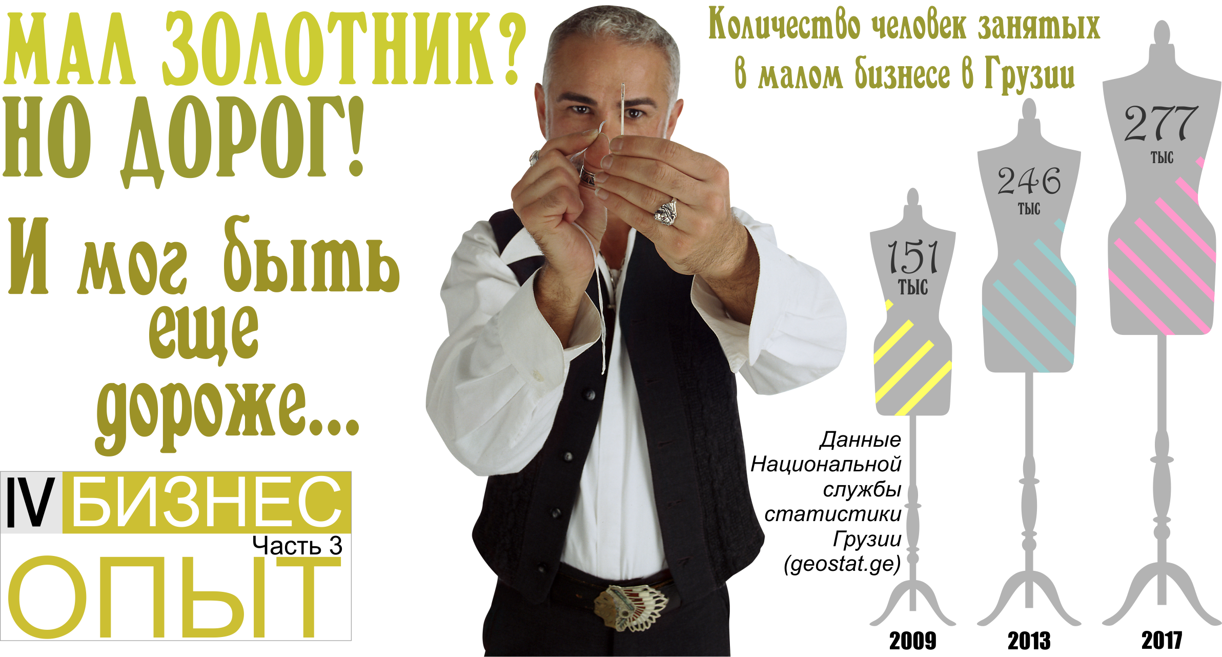 А вот свежие данные за текущий год. По итогам первого квартала оборот компаний малого и среднего бизнеса в Грузии составил 18 млрд лари (7,38 млрд долларов.), что на 18,6% больше, чем за аналогичный период 2017-го, заявил премьер-министр Георгий Квирикашвили со ссылкой на данные национальной службы статистики.