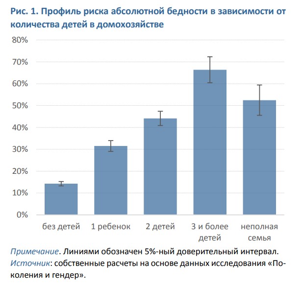 Риск абсолютной бедности среди детей выше, чем в среднем среди населения, подтвердили данные исследования «Поколения и гендер»: возможности использования на примере изучения детской бедности». Хотя по сравнению с кризисными 2015-2016 годами он снизился. Прежде всего этому помогли рост зарплаты и улучшение ситуации на рынке труда. В дополнение к росту доходов вырос эффект от пособий на детей.