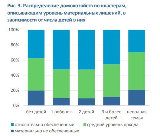 Выше у таких семей и риск абсолютной бедности. 66,4% против 31,5% семей с одним ребенком. В неполных семьях этот уровень — выше 50%. С трудом и большим трудом сводят концы с концами 36,3% таких семей.